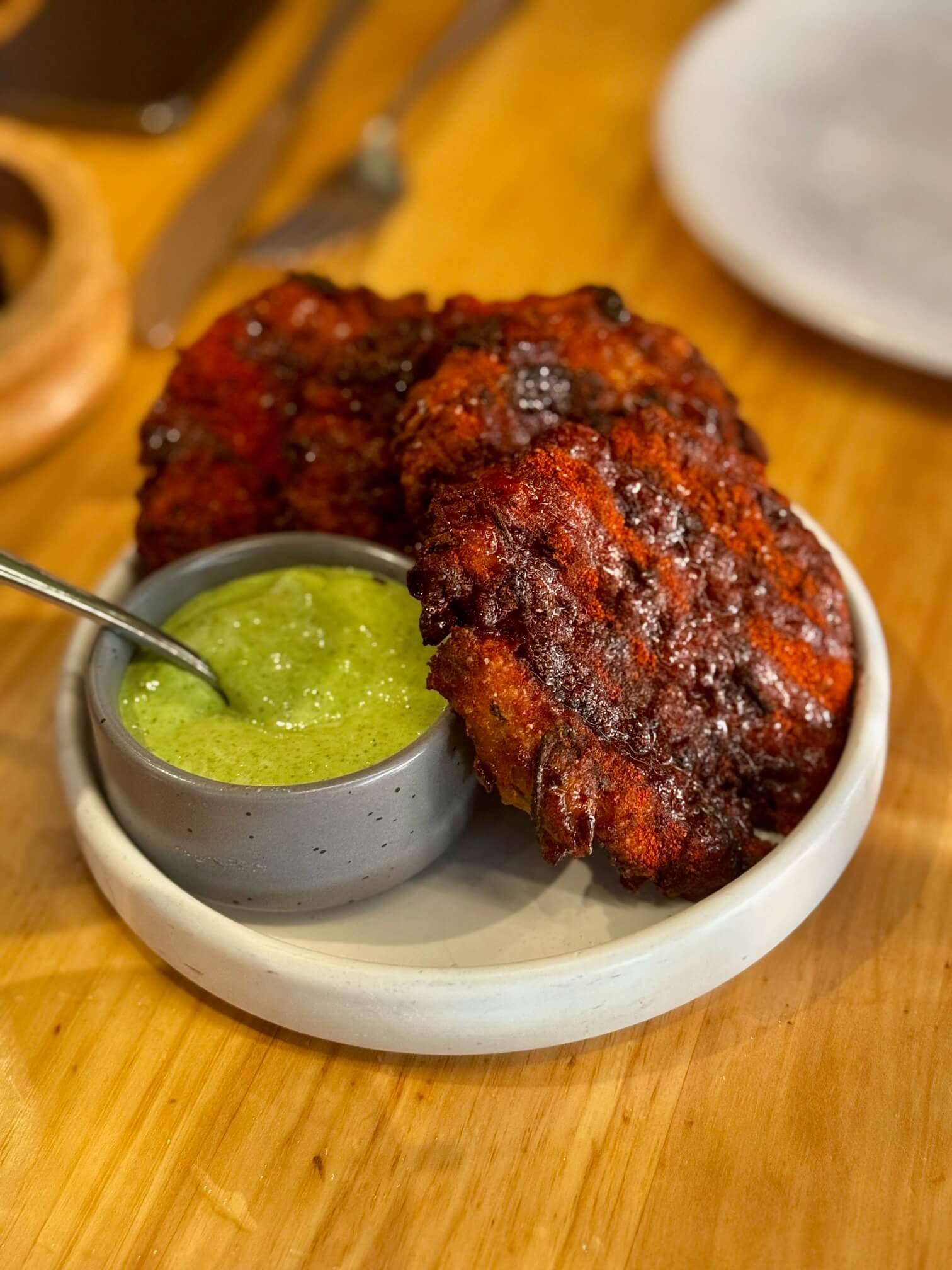 We began with the zucchini fritters, dusted with a fragrant spice blend and served with an herbaceous pesto aioli.