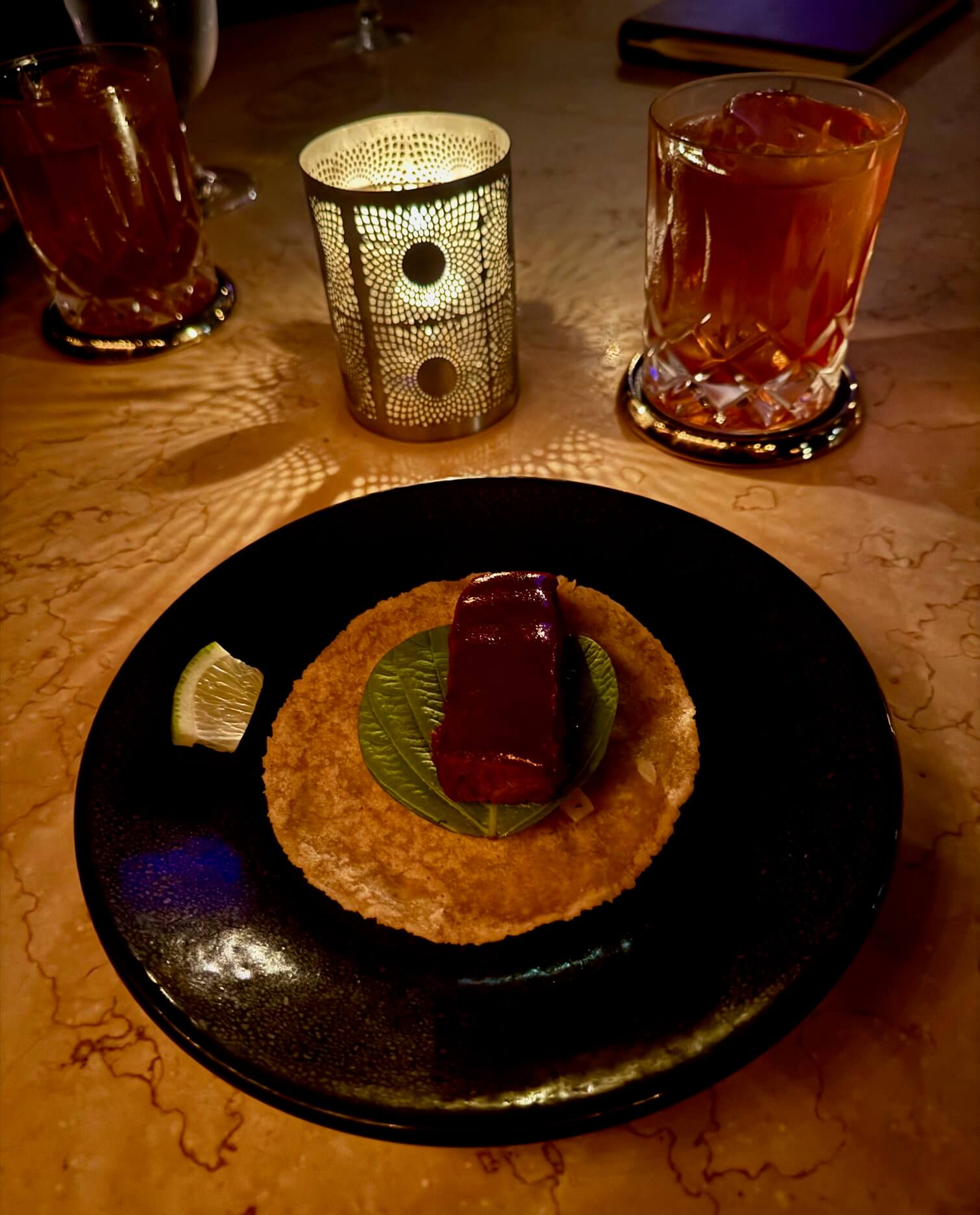 After a short pause, we were served an Old Fashioned with a delicate hint of strawberry that gently perfumed both the nose and palate. This drink was paired with a Kalbi taco made with beef short rib — a delicious bite I savored slowly.