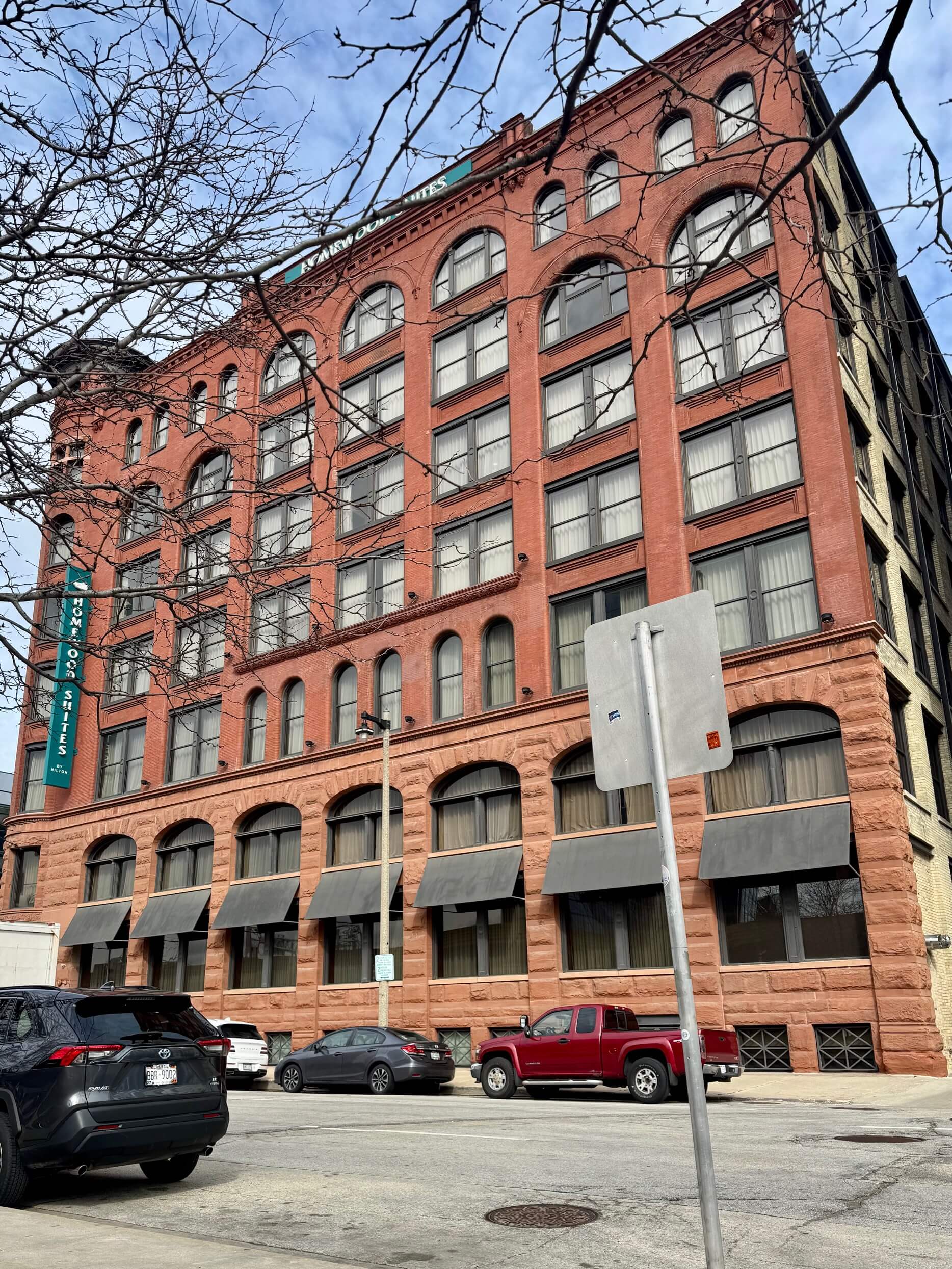Homewood Suites by Hilton Milwaukee Downtown, a thoughtfully restored historic building filled with character. Original architectural details like exposed brick, wood floors, oversized vintage doors, and curated display cases from the renovation give it a unique charm you won’t find in a standard hotel. It also includes a free breakfast, which is great when we bring along our daughter.